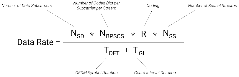 In Wi-Fi, a data rate is used to describe the number of bits per second that are possible to transmit across the link given the current modulation, coding, channel width, guard interval, active spatial streams, and now resource unit allocation. Data rates are marked in each frame, which allows us to understand how slow or fast each frame was transmitted. We also use data rates to estimate the real throughput that is achievable at the upper layers, with a rough rule of thumb that throughput is roughly 40-60% of the Wi-Fi data rate. That’s because the 802.11 protocol has a lot of overhead which uses up some of the bits that are transmitted across the link, and because of its contention mechanism, which prevents data transfer while channel access is achieved. This is true even in a WLAN with a single access point and a single client.